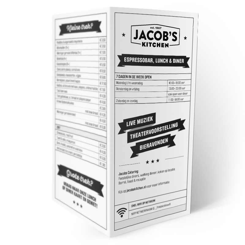 Voor het restaurant van Jacob's Kitchen in Diemen heb ik de huisstijl verzorgd. Niet alleen het logo maar ook flyers, menukaarten,